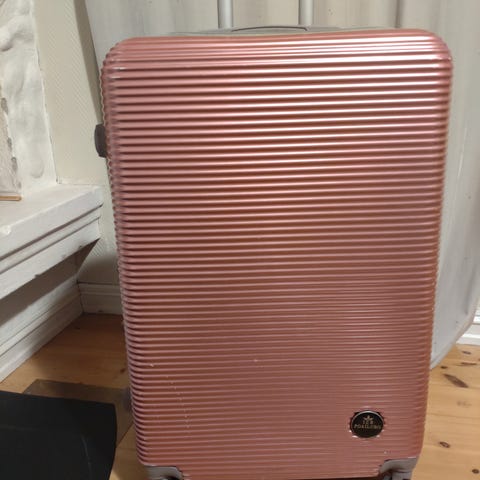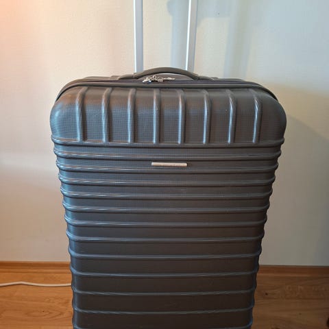 Veldig fin og lett koffert kun brukt på en flygning. Veldig lett og god å trille. Kodelås, rom inndeling i begge sider av kofferten. Egen koppholder på utsiden av kofferten til kaffekopp eller drikkeflaske.