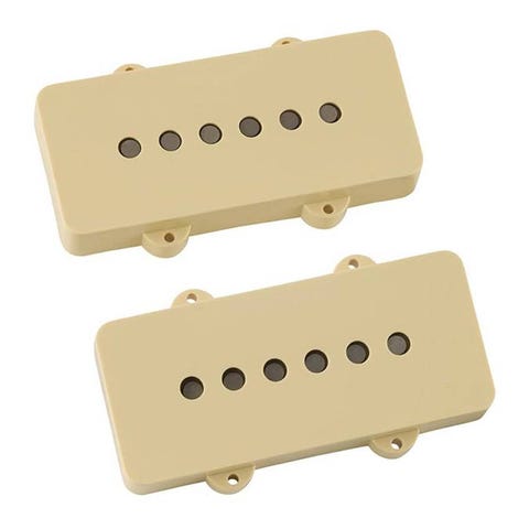 Sett med en lav og en høy mikrofondekselring i kremfarget plast.