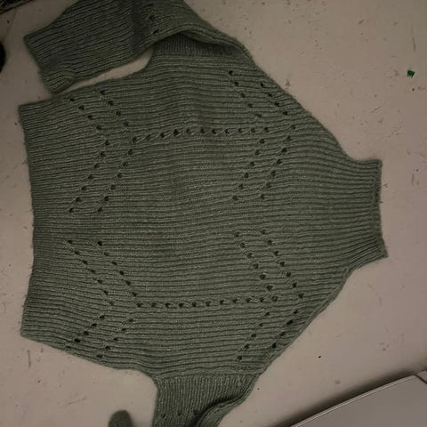 Myk og deilig genser i nydelig grønnfarge. V-halsen er såpass utringet at den ikke brukes, er for gammel til bare skuldre.. muligens str m/l