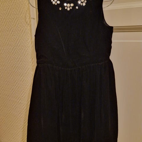 Kjole str. 120 mørk blå med tyllkant nede. 200,-