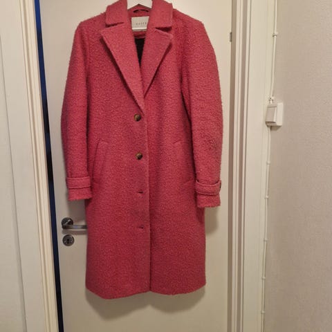 Oransje kåpe for kvinner i størrelse M. Kåpen har knappelukking og lommer foran. Den er foret og har en teksturert overflate.