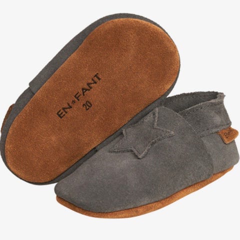Skinntøfler fra En Fant, i sølv med stjerne. Str 20. pent brukt