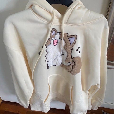 Supermyk genser med kattemotiv på brystet og katteører på hetten