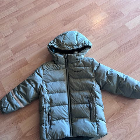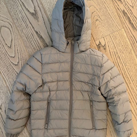 Lyseblå vinterjakke fra Lindex med avtagbar hette. Den er i god stand bortsett fra noen merker rundt mansjettene og en liten flekk øverst på armen.