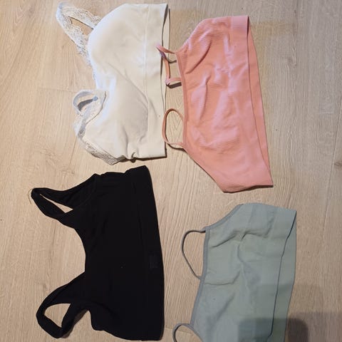 Alt er pent brukt av 1 barn. Glemte å legge ved 2 topper på bilde. Alt er Vasket og rent. De to hvite og de to svarte toppen er i bomull, resten er blanding av elastan/polyamid. Det er også en treningstopp som aldri er brukt. Selges bare samlet.