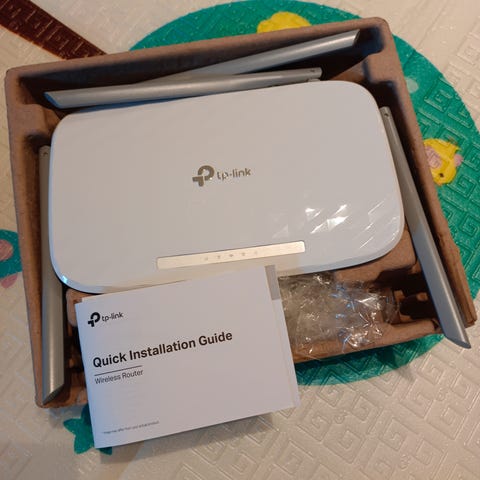 TP-Link TL-WR841N Router med hvit farge. Inkluderer strømadapter, nettverkskabel og bruksanvisning. Designet for kablet og trådløs nettverkstilkobling. Passer til hjemme- eller kontorbruk.