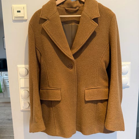 Veldig fin kort jakke i kamelfarget ullstoff, 50 % ull.