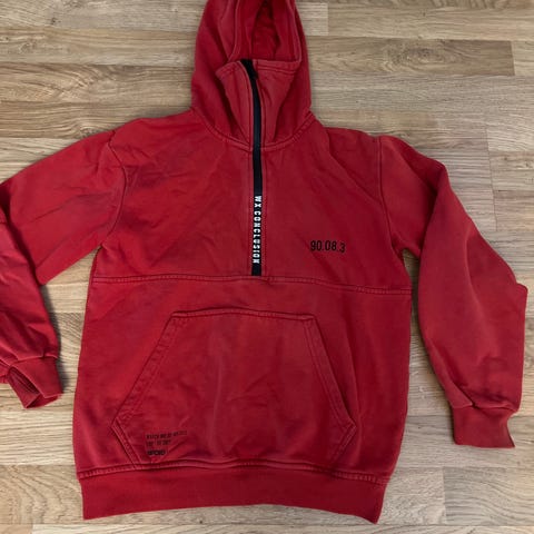 House Brand Bella Ciao barnegenser i størrelse 152/xs unisex. Genseren er rød og har hette. Den har trykk med teksten "Bella Ciao" og flere bynavn på ryggen, samt et lite brodert motiv på brystet.