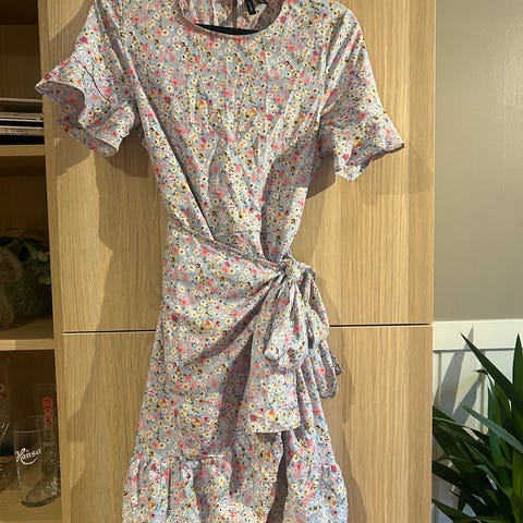 NY MED LAPP Alice Dress i størrelse S. Kjolen har et blomstermønster med farger som inkluderer rosa og blå på en lys bakgrunn. Den har korte ermer og en V-utringning. Nydelig kjole, men blir dessverre ikke brukt.