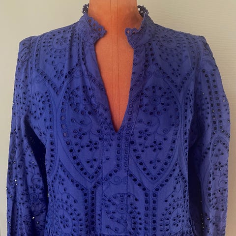 Nydelig lys blå brodert bluse, populær stil fra 1970-tallet.