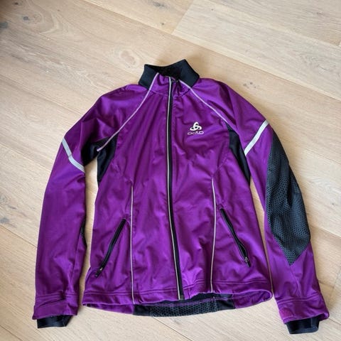 Odlo Vital Lady M skijakke i størrelse medium, designet for kvinner. Jakken er hovedsakelig rød med svarte detaljer og har flere logoer inkludert Norges Skiskytterforbund og det norske flagget. Materialet er godt egnet for sport, med glidelåslommer foran og refleksdetaljer for økt synlighet.