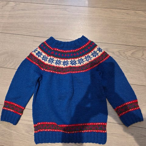 Genseren er håndstrikket og ble kjøpt på en håndarbeidsmesse. Jeg ble fortalt at mønsteret heter «Løvfall».