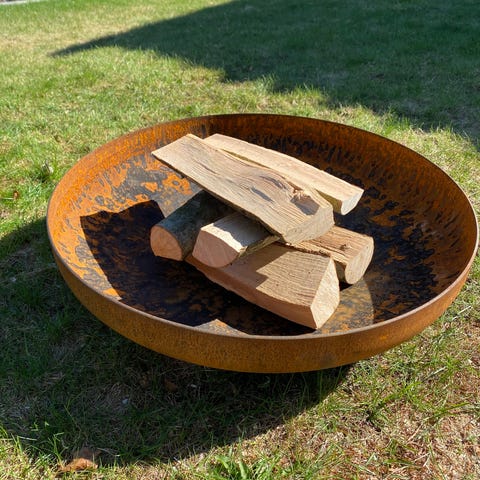 Halvdype stålfat av Corten stål kan brukes enten som bålpanne eller som vannspeil.