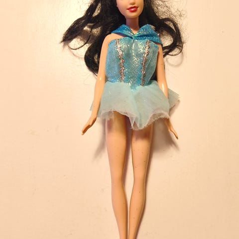 Barbie dukke med blå kjole og gullfargede detaljer. Dukken har langt blondt hår og er designet for barn som lekefigur.