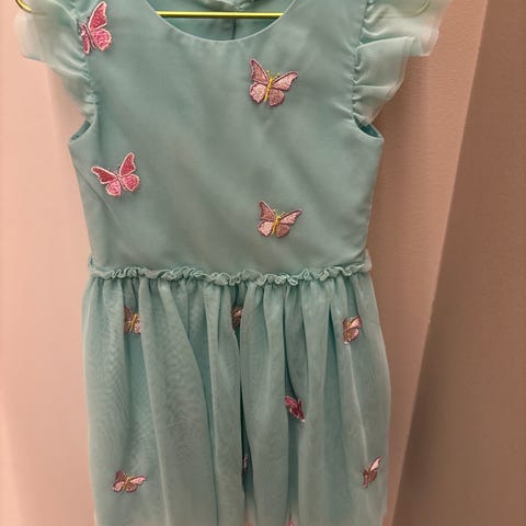 Cubus barnekjole i blå velour, størrelse 128, designet for jenter. Kjolen har korte ermer og knappelukking bak. Materialet gir en myk og behagelig følelse, egnet for ulike anledninger.