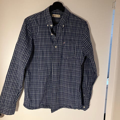 Hollister skjorte for herre i størrelse M. Skjorten har et rutet mønster i blått og hvitt. Laget av lett materiale med knappelukking foran og brodert logo på brystlommen. Passer til hverdagsbruk.