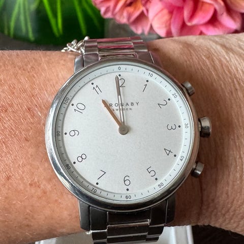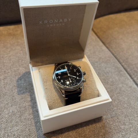 Selger en Kronaby hybrid smartklokke med blå urskive og stålreim. Klokken kombinerer klassisk design med moderne funksjoner.