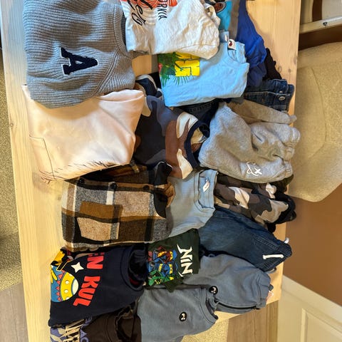 H&M barneklær for gutt i størrelse 110. Inkluderer flere plagg i flerfarget design med ulike motiver og farger. Passer for barn og består av forskjellige typer klær som overdel, bukser og gensere.