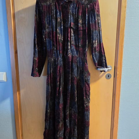 Kjolen har et lite hull øverst ved kragen og en søm som har gått opp i splitten, men dette er lett å reparere. Ellers i fin stand.