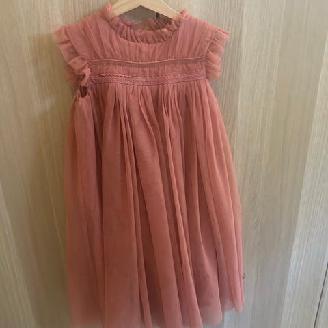 POMPdeLUX Blå kjole i størrelse 134 for jente. Kjolen har et mønster med rosa prikker.