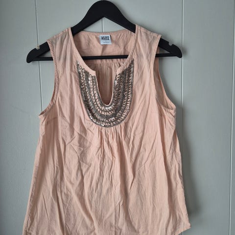 Lite brukt riccovero topp i strl 38. Men har ligget pakket sammen så det er litt bruksmerker på toppen etter at perlene har skrapt litt. Selges derfor billig.