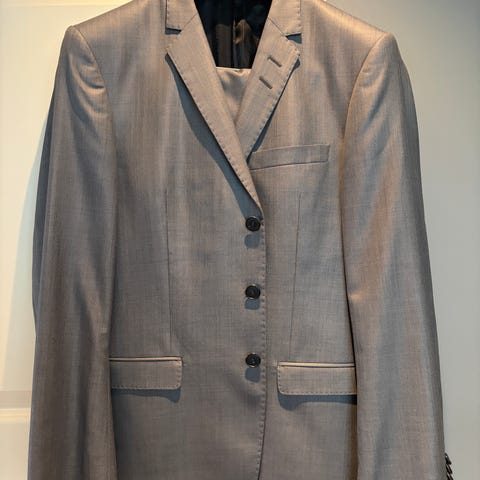 Tiger of Sweden dressjakke og dressbukse i størrelse M, farge grå. Dressjakken har to knapper, flere innerlommer og knappedetaljer på ermene. Dressbuksene har glidelås og knappelukking. Materialet er 100% ull, fôrmaterialet er 35% bomull, 65% polyester