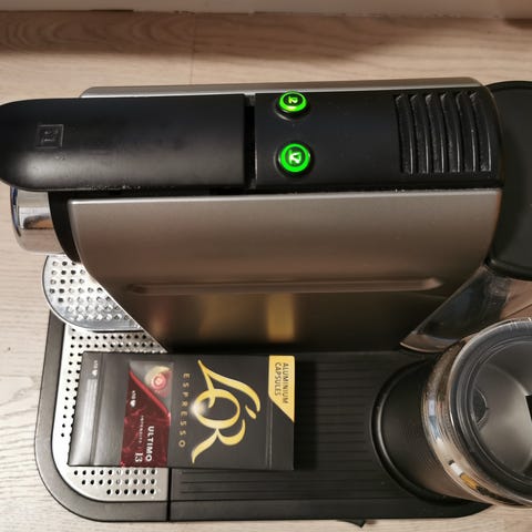 Nespresso Gran Lattisma DeLonghi kaffemaskin med integrert melkeskummer og tilhørende kapselholder i metall.