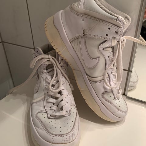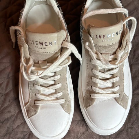 Disse skoene er kun brukt få ganger. Sølv «fargen» er noe slitt av øverst på innsiden av begge skoene (se bilder) da skoene har gnisset mot hverandre.