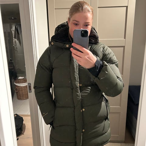 Knallfi. dunjakke i flott beige med gullknapper og pels, , kjempevarm og myk,90/10 dun. Str L
