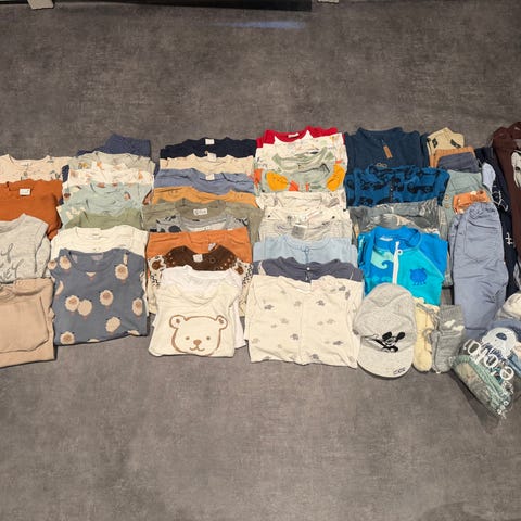 Diverse klær i str 56 selges. Pysjer, langerma-, korterma- og omslagsbodyer, bukser. Har selv kjøpt det brukt, kun vært vasket og ikke brukt i mitt eie.