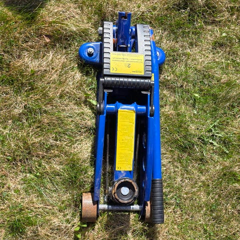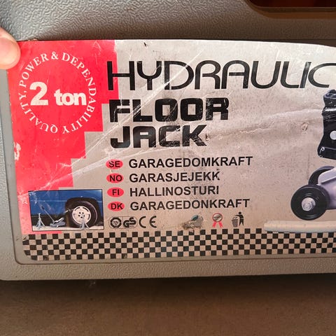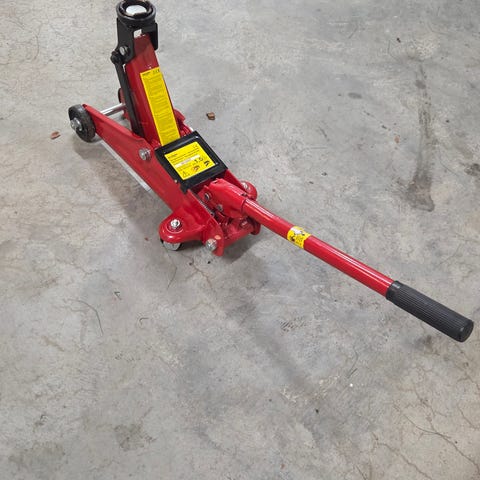 Hydraulisk garasjejekk med kapasitet på 1500kg. Laget i rødt stål, utstyrt med håndtak for enkel betjening.