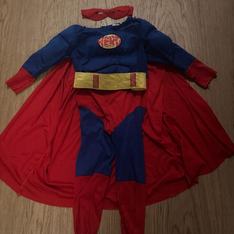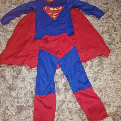 Supermannkostyme str 6-8 år selges. Består av overdel med innlagte muskler med fin og avtagbar kappe.