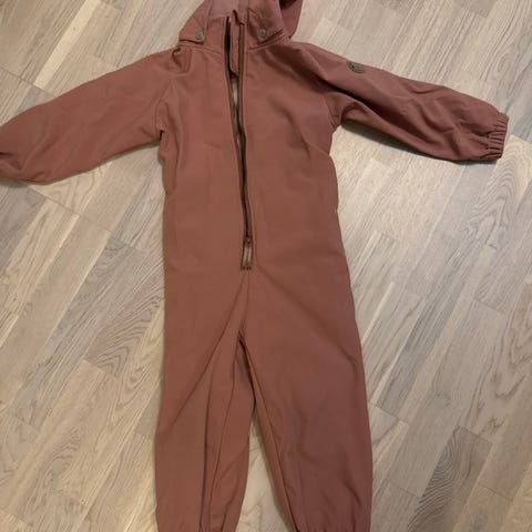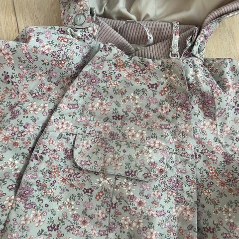Selger en nydelig mørk ferskenfarget parkdress fra Wheat, str.86. Blomstrete mønster i hette.