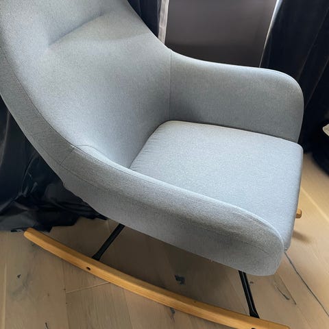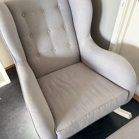Stolen er fra Wellbeck & Child, og er svært komfortabel og solid. Den er tidligere brukt av en familie til et barn, så den har noen små flekker i stoffet, men de er lette å dekke med et saueskinn eller pledd – og stolen ser fortsatt veldig fin ut.