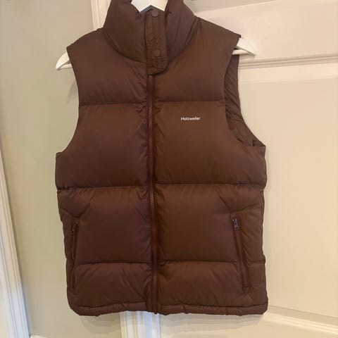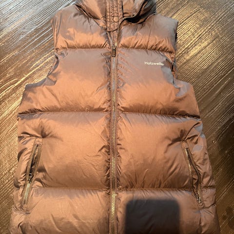 Bergans Down Vest Sporti er en dunvest for damer i størrelse S. Vesten har en gyllen brun farge. Den har flere lommer med glidelås, inkludert en på brystet og på innsiden. Ekstra tykk og nesten ikke brukt. Et kupp !