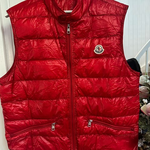 Moncler Aydat str S. Moncler str 1. Oversize råkul vest Moncler. Back edition, ikke å få tak i lenger. Denne har aldri vært tatt i bruk- så den er ny som fra butikk. Kun hengt i skap, det er den alt for fin til. Selges med kleshenger fra samme merke. Kragen er avtagbar. Lommer i front. Nypris 10.500 kr. Kjøpt i Sandvika.