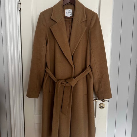 Fin lett overgangskåpe/ lang jakke i merket Onstage. Jakken er i lett tovet ull med ermer i skinn. Den lukkes ved å ta en del av kragen over skulderen. Rekker ca til knærne.