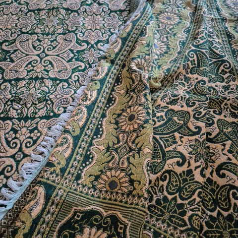 Nydelige tepper fra Tunisia. Det ene ble brukt en kort periode som sengeteppe og har to "skygger" på ene kanten (grønn te-flekker som sikkert lett kan vaskes bort). Disse har ligget nedpakket i mange år, er for øvrig helt uten slitasje. Innser at jeg må kvitte meg med de da de tar for stor plass i skapet... Tror det er vevd med grov bomullstråd? Kjempefine, synes jeg, men passer ikke lenger i vårt hjem. Forhåpentligvis kan de glede noen andre? 300 kr per stykk eller 500 kr for begge.