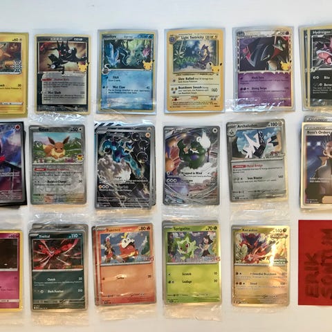 Selger en haug med Pokemon topps kort fra 1999 og 2000, samt TV-series kort.