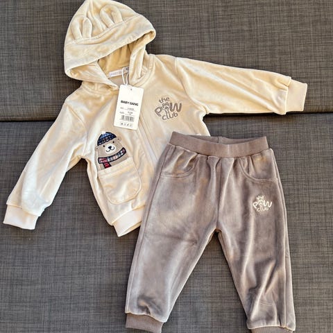 Genseren og buksene har kun blitt brukt én gang, men de var for små. Så det er ingen flekker eller andre slitasje.