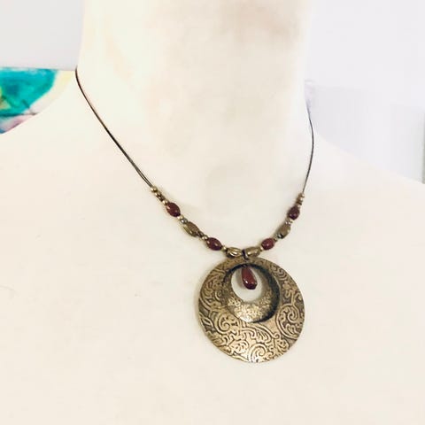 Dekorativt halskjede i bohemsk stil med flere metallanheng. Smykket har mynt- og symbolske detaljer som gir et røft, vintage preg. Passer perfekt som statement til en enkel topp eller kjole. Se bilder for mål.