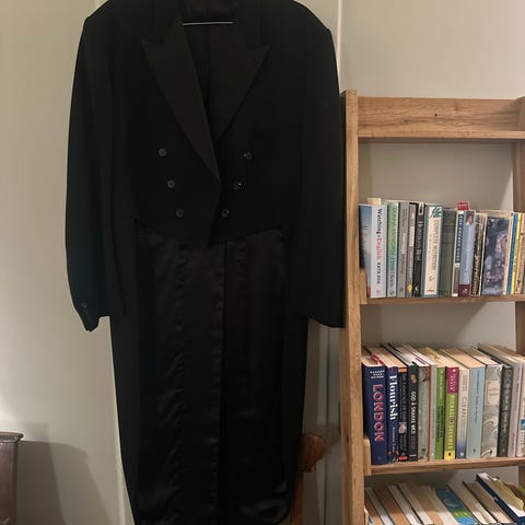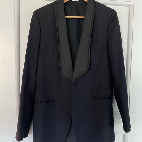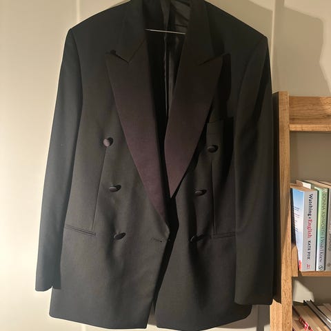 Smoking med «the «end» i baken på smokingjakka og tangenter på kragen. Buksen har et bittelite hull ved låret og en liten revne nederst på gulfen.