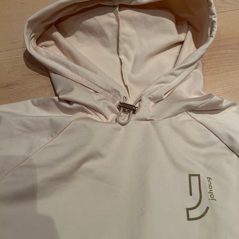 Johaug Annet treningsgenser for dame i størrelse S. Genseren er grå med rosa detaljer og har hette. Egnet for ulike typer trening og sport.