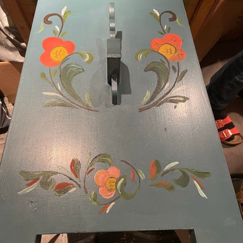 Håndskåret stativbord med innlagte detaljer. Vintage sidebord med sammenleggbar base. Høyden er 39.