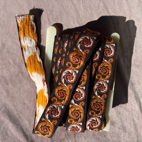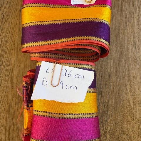 Håndlaget vevde bånd i rødt, grønt og svart
