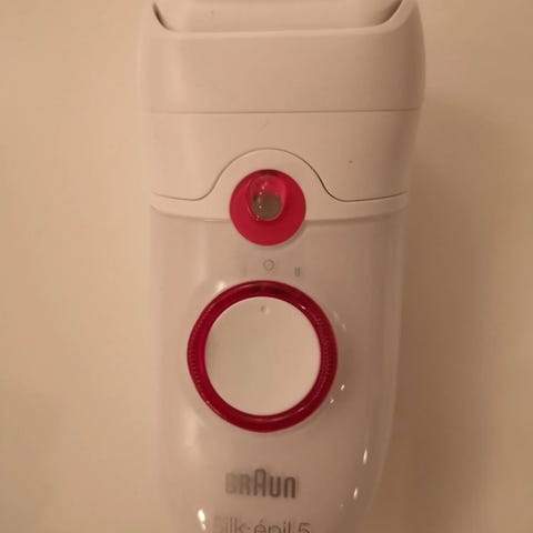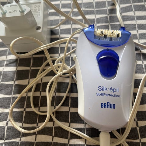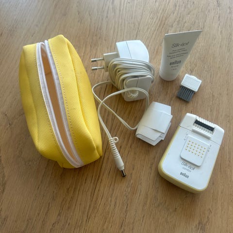 Braun Silk-épil epilator i hvit farge. Produktet inkluderer epilatoren, strømadapter og en gul oppbevaringspose.