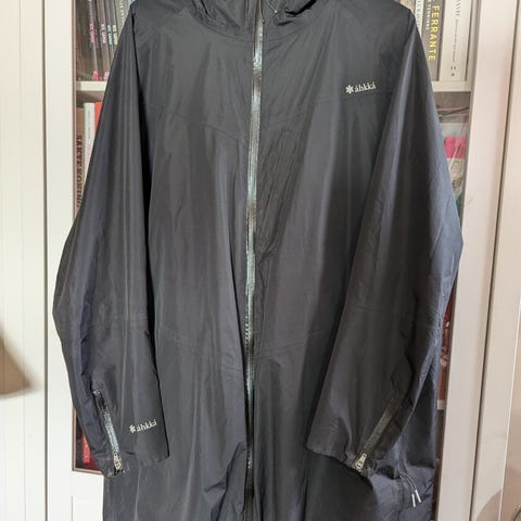Ellos lett vinterjakke størrelse 56, dyp svart farge. Jakken har quiltet mønster med hette , glidelås og knappelukking foran. Materialet er lett og isolerende.