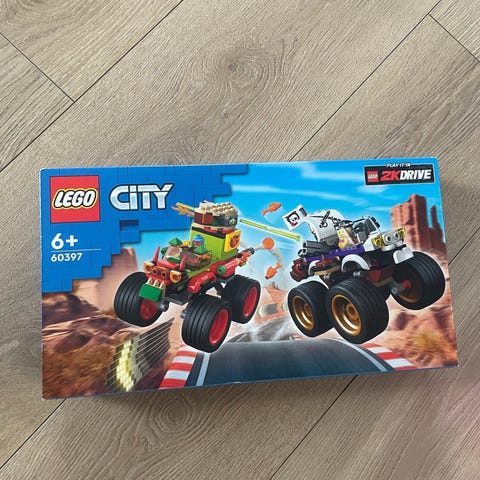 LEGO City 60180 Monster Truck byggesett med blå og oransje farger. Inkluderer store hjul, en minifigur og tilbehør som flammer. Passer for barn og samlere som er interessert i LEGO City-temaet.