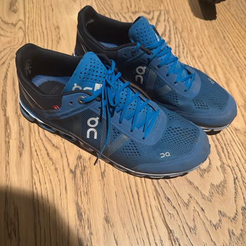 Inov-8 trailfly speed løpesko i størrelse 44,5 blå farge. Egnet for løping, mye bruk igjen med liten rift i fremside som kan lett limes.