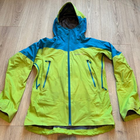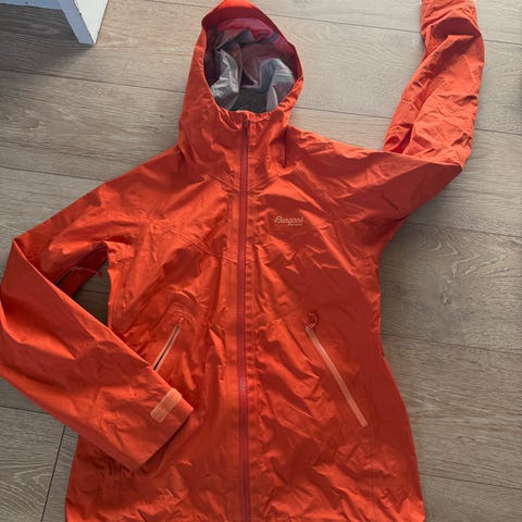 Behagelig jakke. Lett å ha på, og tar liten plass i sekken. Orange, str m. Den har litt slitasje under høyre arm, og nede på venstre arm, se bild.